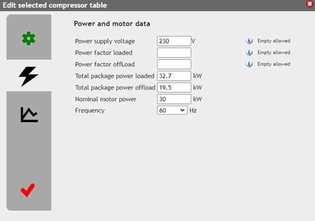 Go to ‘Power and Motor data’. Edit Voltage and/or load/unload kW and/or PF.